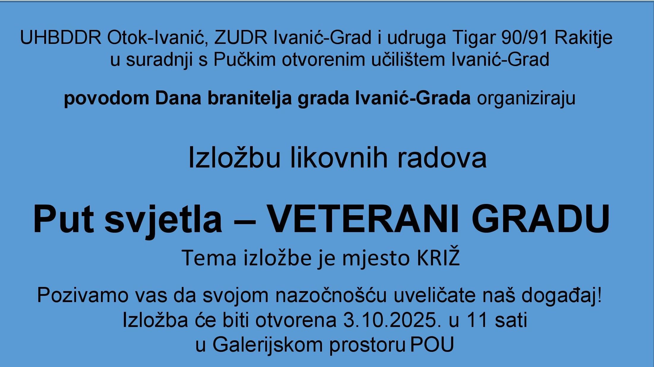 Pozivamo vas na izložbu likovnih radova likovne udruge Tigar 90/91 Rakitje “PUT SVJETLA – VETERANI GRADU”