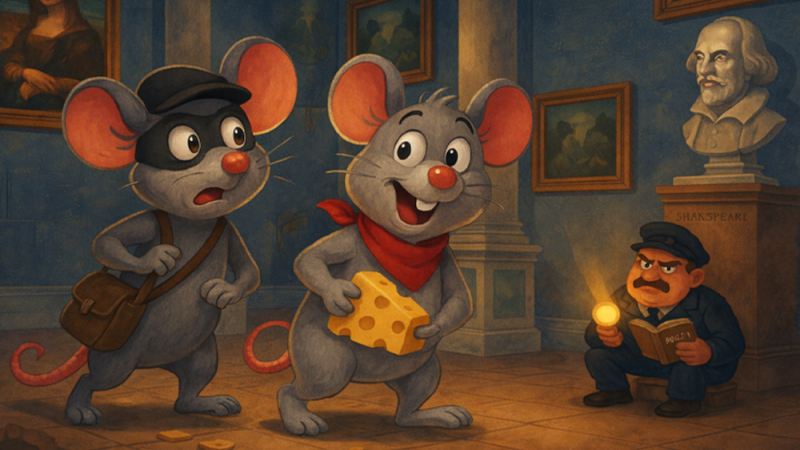 Miš Maš i Miš Pliš dva su nestašna, simpatična miša koji sanjaju o jednoj stvari – siru! U svojoj potrazi za slasnim zalogajem, smišljaju hrabri (i pomalo nepromišljen) plan da se ušuljaju u – kako misle – tvornicu sira. No, spletom smiješnih okolnosti i pravom malom zabunom, umjesto u carstvo sira, naši mišići zalutaju u čudesan svijet umjetnina – muzej! Tamo započinje njihova neobična noćna pustolovina. Među tihim hodnicima i izloženim umjetninama, Miš Maš i Miš Pliš susreću razne skulpture, slike i bistu slavnog Williama Shakespearea, koja iznenada oživi! Shakespeare, vječni čuvar priča i mašte, pridružuje se njihovoj pustolovini i pomaže im osmisliti plan – kako ipak doći do hrane, ali na posve drugačiji, duhovit i poučan način.