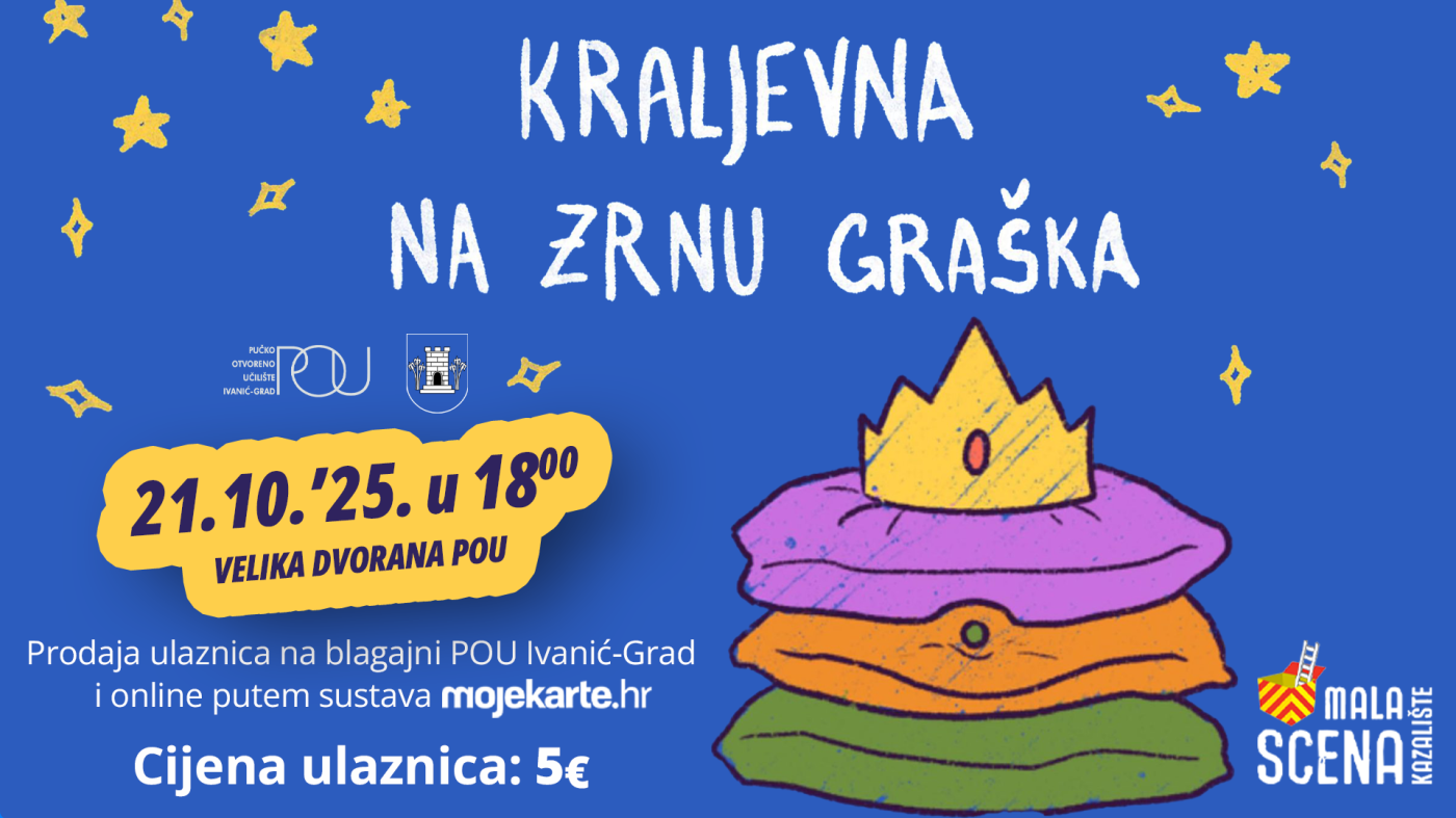 Ulaznice: POU Ivanić-Grad, Moslavačka 11 (blagajna na katu) svakim radnim danom od 8 do 15 sati; sat vremena prije početka predstave na blagajni kina (prizemlje) ili online na https://www.mojekarte.hr/hr/kraljevna-na-zrnu-graska-mala-scena/ulaznice-643338.html